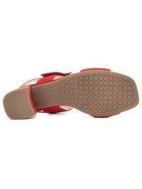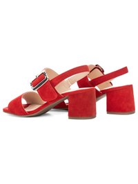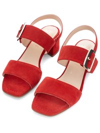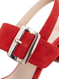 Feet wearing red suede block-heeled sandals with ankle straps and silver buckles, paired with white cropped pants, on a white background.