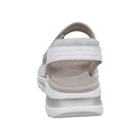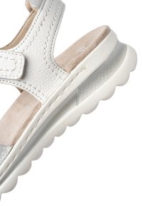 White open-toe sandal with adjustable straps, cushioned beige insole, and a white, textured, thick rubber sole.