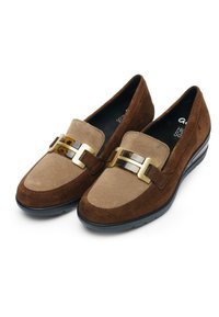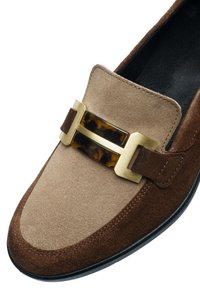 Brown suede loafer with beige upper, gold buckle detail, and black rubber sole with slight wedge heel.