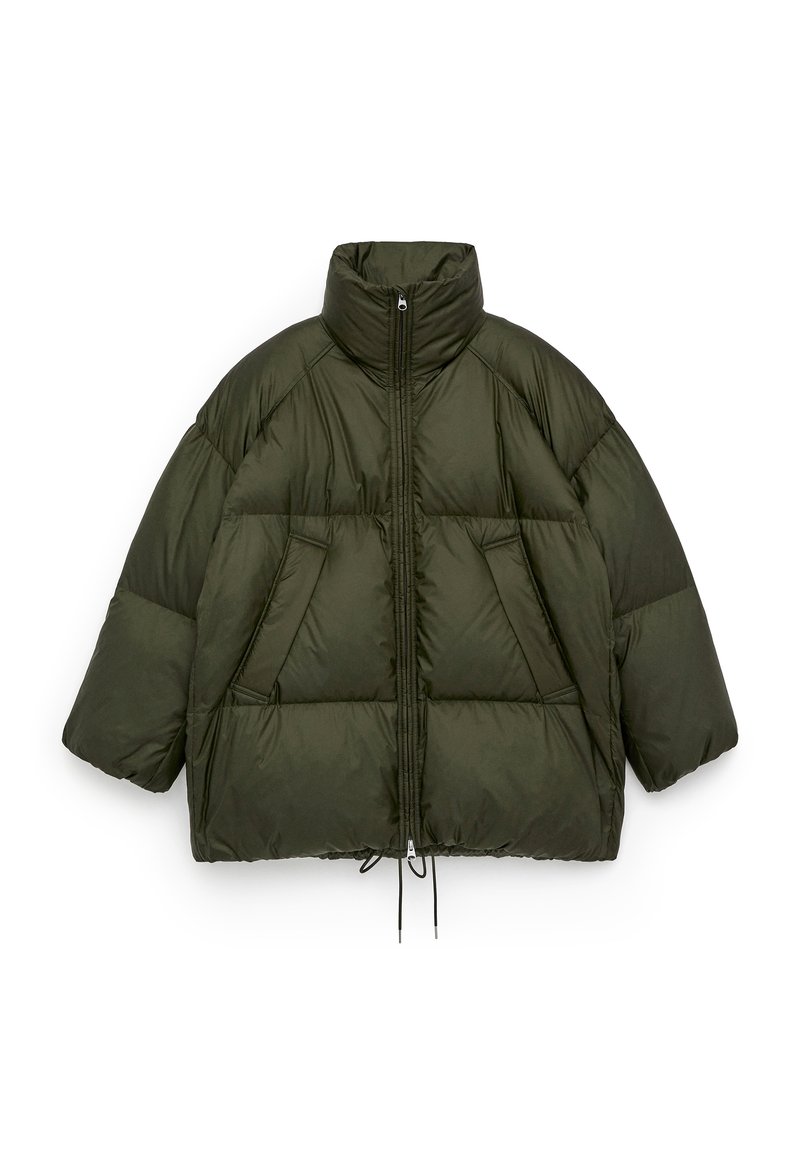 Olive green puffer jacket with high collar, zip front, oversized shape, two front pockets, and drawstring waist. Smooth, padded texture.