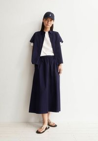 Woman wearing a navy blue midi skirt with an elastic waistband and white braided sandals, standing with hands in pockets.