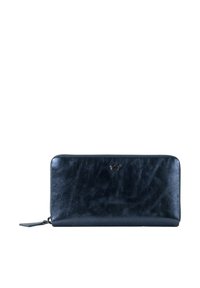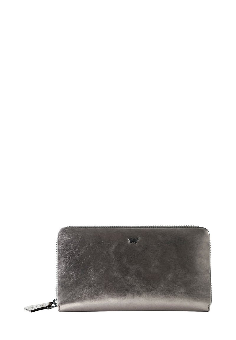 Metallic gray leather wallet with a smooth texture, zippered closure, and a subtle logo detail at the center front.