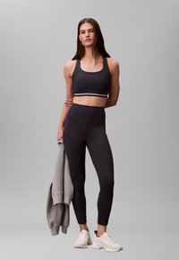 Woman wearing black sports bra, high-waisted black leggings, and white chunky sneakers, standing against a plain gray background.
