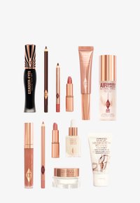 - PILLOW TALK LIP CHEAT - PILLOW TALK MEDIUM: INGREDIENTS: CYCLOPENTASILOXANE, SYNTHETIC WAX, POLYBUTENE, ISODODECANE, HYDROGENATED COTTONSEED OIL, MICA, CERA MICROCRISTALLINA/MICROCRYSTALLINE WAX/CIRE MICROCRISTALLINE, OZOKERITE, ETHYLHEXYL PALMITATE, SIMMONDSIA CHINENSIS (JOJOBA) SEED OIL, TOCOPHEROL, BARIUM SULFATE, ASCORBYL PALMITATE, SILICA DIMETHYL SILYLATE, BUTYLENE GLYCOL, CAPRYLYL GLYCOL, PHENOXYETHANOL, SODIUM HYALURONATE, HEXYLENE GLYCOL, [+/- TITANIUM DIOXIDE (CI 77891), IRON OXIDES (CI 77491, CI 77492, CI 77499), RED 7 (CI 15850)]. PILLOW TALK COLLAGEN LIP BATH - PILLOW TALK: INGREDIENTS: POLYBUTENE, OCTYLDODECANOL, DICAPRYLYL CARBONATE, DIISOSTEARYL MALATE, BIS-DIGLYCERYL POLYACYLADIPATE-2, PENTAERYTHRITYL TETRAISOSTEARATE, C18-36 ACID TRIGLYCERIDE, ISOHEXADECANE, PEG-30 DIPOLYHYDROXYSTEARATE, STEARALKONIUM HECTORITE, SIMMONDSIA CHINENSIS (JOJOBA) SEED OIL, CAPRYLIC/CAPRIC TRIGLYCERIDE, SOLUBLE COLLAGEN, MENTHA PIPERITA (PEPPERMINT) OIL, PUNICA GRANATUM (POMEGRANATE) FLOWER EXTRACT, SCLEROCARYA BIRREA SEED OIL, SODIUM HYALURONATE, TOCOPHERYL ACETATE, TOCOPHEROL, LEUCONOSTOC/RADISH ROOT FERMENT FILTRATE, TRIPEPTIDE-1, PALMITOYL TRIPEPTIDE-1, ETHYLHEXYL PALMITATE, MENTHOL, PROPYLENE CARBONATE, TRIBEHENIN, POLYGLYCERYL-3 DIISOSTEARATE, ETHYLENE/PROPYLENE/STYRENE COPOLYMER, BUTYLENE/ETHYLENE/STYRENE COPOLYMER, SORBITAN ISOSTEARATE, TRIETHOXYCAPRYLYLSILANE, ALUMINUM HYDROXIDE, PHENOXYETHANOL, XANTHAN GUM, RETINYL PALMITATE, LACTIC ACID, PENTAERYTHRITYL TETRA-DI-T-BUTYL HYDROXYHYDROCINNAMATE, LIMONENE, [+/- TITANIUM DIOXIDE (CI 77891), IRON OXIDES (CI 77491, CI 77492, CI 77499), RED 6 LAKE (CI 15850), RED 7 LAKE (CI 15850)]. EXAGGER-EYES VOLUME MASCARA - EXAGGER-BLACK: INGREDIENTS: AQUA/WATER/EAU, SYNTHETIC BEESWAX, ACRYLATES COPOLYMER, JOJOBA ESTERS, HYDROGENATED OLIVE OIL STEARYL ESTERS, COPERNICIA CERIFERA CERA/COPERNICIA CERIFERA (CARNAUBA) WAX/CIRE DE CARNAUBA, PROPANEDIOL, PALMITIC ACID, STEARIC ACID, AMINOMETHYL PROPANOL, ACACIA SENEGAL GUM, PHENOXYETHANOL, CAPRYLYL GLYCOL, HYDROXYETHYLCELLULOSE, POTASSIUM SORBATE, SODIUM DEHYDROACETATE, DISODIUM PHOSPHATE, POLYSORBATE 60, TOCOPHEROL, SODIUM PHOSPHATE, [+/- IRON OXIDES (CI 77499)]. ROCK 'N' KOHL - BARBARELLA BROWN: INGREDIENTS: DIMETHICONE, SYNTHETIC WAX, SILICA, STEARYL DIMETHICONE, CAPRYLIC/CAPRIC TRIGLYCERIDE, TRIMETHYLSILOXYSILICATE/DIMETHICONOL CROSSPOLYMER, MICA, OCTADECENE, DIMETHICONE/VINYL DIMETHICONE CROSSPOLYMER, PENTAERYTHRITYL TETRA-DI-T-BUTYL HYDROXYHYDROCINNAMATE, ARGANIA SPINOSA (ARGAN) KERNEL OIL, PANTHENOL, CHAMOMILLA RECUTITA (MATRICARIA) FLOWER EXTRACT, TOCOPHEROL, [+/- TITANIUM DIOXIDE (CI 77891), IRON OXIDES (CI 77491, CI 77492, CI 77499)]. CHARLOTTE'S MAGIC CREAM (SPF): INGREDIENTS: AQUA/WATER/EAU, HOMOSALATE, GLYCERYL STEARATE SE, ETHYLHEXYL SALICYLATE, BUTYLENE GLYCOL, GLYCERIN, BUTYL METHOXYDIBENZOYLMETHANE, OCTOCRYLENE, C12-15 ALKYL BENZOATE, CETYL ALCOHOL, CYCLOPENTASILOXANE, DIMETHICONE, PHENOXYETHANOL, BUTYROSPERMUM PARKII (SHEA) BUTTER, STEARETH-21, AVENA SATIVA (OAT) KERNEL EXTRACT, CARBOMER, DIMETHICONOL, POTASSIUM CETYL PHOSPHATE, CHLORPHENESIN, CAPRYLYL GLYCOL, XANTHAN GUM, HYDROLYZED VIOLA TRICOLOR EXTRACT, ALLANTOIN, ALOE BARBADENSIS LEAF JUICE POWDER, DISODIUM EDTA, TOCOPHERYL ACETATE, CAMELLIA OLEIFERA (CAMELLIA) SEED OIL, ROSA CANINA FRUIT OIL, ROSA DAMASCENA EXTRACT, SODIUM HYDROXIDE, HELIANTHUS ANNUUS (SUNFLOWER) SEED OIL, MICHELIA ALBA LEAF OIL, SODIUM LACTATE, PEG-8, ETHYLHEXYLGLYCERIN, COCO-GLUCOSIDE, SODIUM HYALURONATE, TOCOPHEROL, ASCORBYL PALMITATE, PLUMERIA RUBRA FLOWER EXTRACT, ASCORBIC ACID, CITRIC ACID, PALMITOYL TRIPEPTIDE-1, PALMITOYL TETRAPEPTIDE-7, NICOTIANA SYLVESTRIS LEAF CELL CULTURE, LINALOOL, CITRONELLOL, GERANIOL. CHARLOTTE’S MAGIC CREAM (NON-SPF): INGREDIENTS: AQUA/WATER/EAU, C12-15 ALKYL BENZOATE, GLYCERYL STEARATE SE, BUTYLENE GLYCOL, GLYCERIN, ISONONYL ISONONANOATE, CAPRYLIC/CAPRIC TRIGLYCERIDE, CETYL ALCOHOL, ETHYLHEXYL PALMITATE, CYCLOPENTASILOXANE, DIMETHICONE, POLYESTER-7, PHENOXYETHANOL, NEOPENTYL GLYCOL DIHEPTANOATE, HYDROGENATED RAPESEED OIL, BUTYROSPERMUM PARKII (SHEA) BUTTER, STEARETH-21, AVENA SATIVA (OAT) KERNEL EXTRACT, CARBOMER, DIMETHICONOL, POTASSIUM CETYL PHOSPHATE, CHLORPHENESIN, CAPRYLYL GLYCOL, XANTHAN GUM, HYDROLYZED VIOLA TRICOLOR EXTRACT, ALLANTOIN, ALOE BARBADENSIS LEAF JUICE POWDER, DISODIUM EDTA, TOCOPHERYL ACETATE, CAMELLIA OLEIFERA (CAMELLIA) SEED OIL, ROSA CANINA FRUIT OIL, ROSA DAMASCENA EXTRACT, SODIUM HYDROXIDE, HELIANTHUS ANNUUS (SUNFLOWER) SEED OIL, MICHELIA ALBA LEAF OIL, SODIUM LACTATE, PEG-8, ETHYLHEXYLGLYCERIN, COCO-GLUCOSIDE, SODIUM HYALURONATE, TOCOPHEROL, ASCORBYL PALMITATE, PLUMERIA RUBRA FLOWER EXTRACT, ASCORBIC ACID, CITRIC ACID, PALMITOYL TRIPEPTIDE-1, PALMITOYL TETRAPEPTIDE-7, HYDROLYZED VEGETABLE PROTEIN, CITRONELLOL, GERANIOL, LINALOOL. CHARLOTTE'S MAGIC SERUM CRYSTAL ELIXIR: INGREDIENTS: AQUA/WATER/EAU, NIACINAMIDE, GLYCERETH-26, TRIHEPTANOIN, GLYCERIN, METHYL GLUCETH-20, SILICA, BUTYROSPERMUM PARKII (SHEA) OIL, CAMELLIA OLEIFERA (CAMELLIA) SEED OIL, DIMETHYL ISOSORBIDE, MYROTHAMNUS FLABELLIFOLIA LEAF EXTRACT, SCHISANDRA CHINENSIS FRUIT EXTRACT, SAUSSUREA INVOLUCRATA EXTRACT, ALOE BARBADENSIS LEAF JUICE, POLYGLUTAMIC ACID, CHONDRUS CRISPUS EXTRACT, ROSA CANINA FRUIT EXTRACT, POLYSORBATE 20, OCTYLDODECANOL, LITHOTHAMNION CALCAREUM EXTRACT, SODIUM GLUCONATE, SODIUM HYALURONATE, PLUMERIA ALBA FLOWER EXTRACT, PLUMERIA RUBRA FLOWER EXTRACT, MAGNESIUM ASPARTATE, ZINC GLUCONATE, COPPER GLUCONATE, SOLANUM TUBEROSUM (POTATO) PULP EXTRACT, ASCORBIC ACID, GOLD, GLUTATHIONE, TOCOPHERYL ACETATE, ACETYL TETRAPEPTIDE-11, ACETYL TETRAPEPTIDE-9, OCTYLDODECYL OLEATE, GLYCERYL STEARATE, PEG-100 STEARATE, BUTYLENE GLYCOL, CARBOMER, OCTYLDODECYL STEAROYL STEARATE, PENTYLENE GLYCOL, SORBITOL, POLYHYDROXYSTEARIC ACID, PROPANEDIOL, BIOSACCHARIDE GUM-4, SODIUM BENZOATE, XANTHAN GUM, SODIUM HYDROXIDE, QUARTZ, AMETHYST POWDER, HYDRATED SILICA, RUBY POWDER, LACTIC ACID, POTASSIUM SORBATE, CAPRYLYL GLYCOL, 1,2-HEXANEDIOL, PHENOXYETHANOL,
