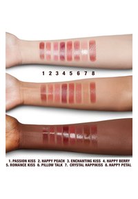- DIISOSTEARYL MALATE, BIS-BEHENYL/ISOSTEARYL/PHYTOSTERYL DIMER DILINOLEYL DIMER DILINOLEATE, BIS-DIGLYCERYL POLYACYLADIPATE-2, HYDROGENATED POLYISOBUTENE, CERESIN, OCTYLDODECANOL, SYNTHETIC WAX, PENTAERYTHRITYL TETRAISOSTEARATE, 1,2-HEXANEDIOL, DISTEARDIMONIUM HECTORITE, SODIUM HYALURONATE, PASSIFLORA EDULIS (PASSION FRUIT) SEED OIL, THEOBROMA GRANDIFLORUM (CUPUACU) SEED BUTTER, PALMITOYL HEXAPEPTIDE-12, PARFUM (FRAGRANCE), TOCOPHERYL ACETATE, PROPYLENE CARBONATE, CAPRYLIC/CAPRIC TRIGLYCERIDE, C10-18 TRIGLYCERIDES, TRIOLEIN, STEARALKONIUM HECTORITE, GLYCERYL DIOLEATE, [+/- TITANIUM DIOXIDE (CI 77891), IRON OXIDES (CI 77491, CI 77499), RED 7 LAKE (CI 15850), YELLOW 6 LAKE (CI 15985)]