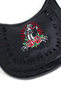 Ed says: Punk isn't Dead! The new Pantha Pin Shoulder Bag features Ed's full-colour, high-impact embroidery, framed by black utility safety pins along the front seams. Inside, an all-over graphic lining showcases Ed's archive illustrations. With a zip closure and adjustable strap for comfort, embrace a new era of punk fashion, your way.