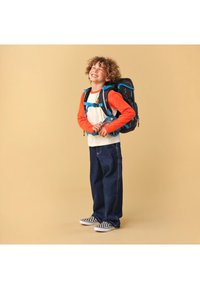 Child with curly hair wearing checkered slip-on shoes and blue backpack straps over orange and white long-sleeve shirt, fastening chest strap.
