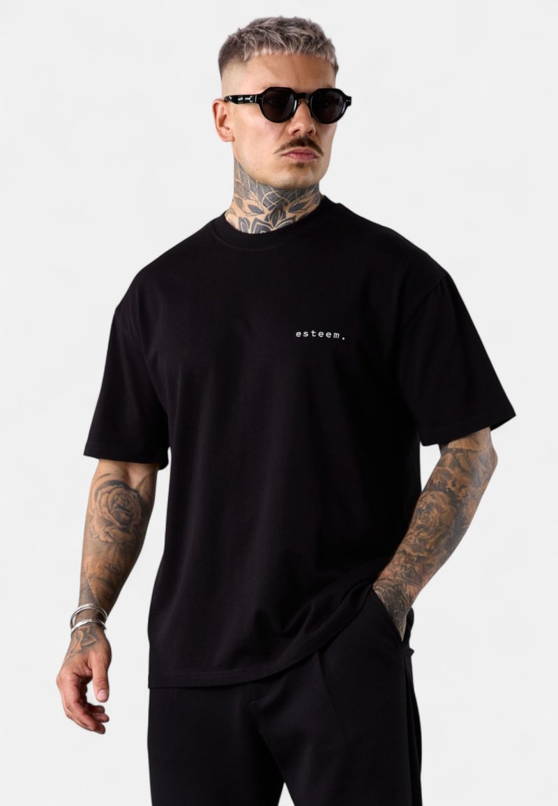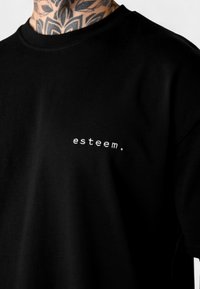 Black short-sleeve t-shirt made of cotton, featuring a small white text logo "esteem." on the left side. Smooth texture, relaxed fit.