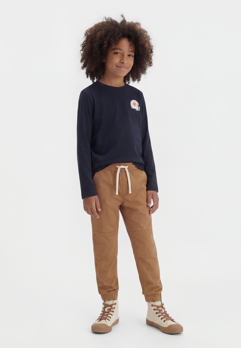 Child with curly hair wearing navy long-sleeve shirt with helmet logo, tan drawstring pants, and beige high-top shoes standing against white background.