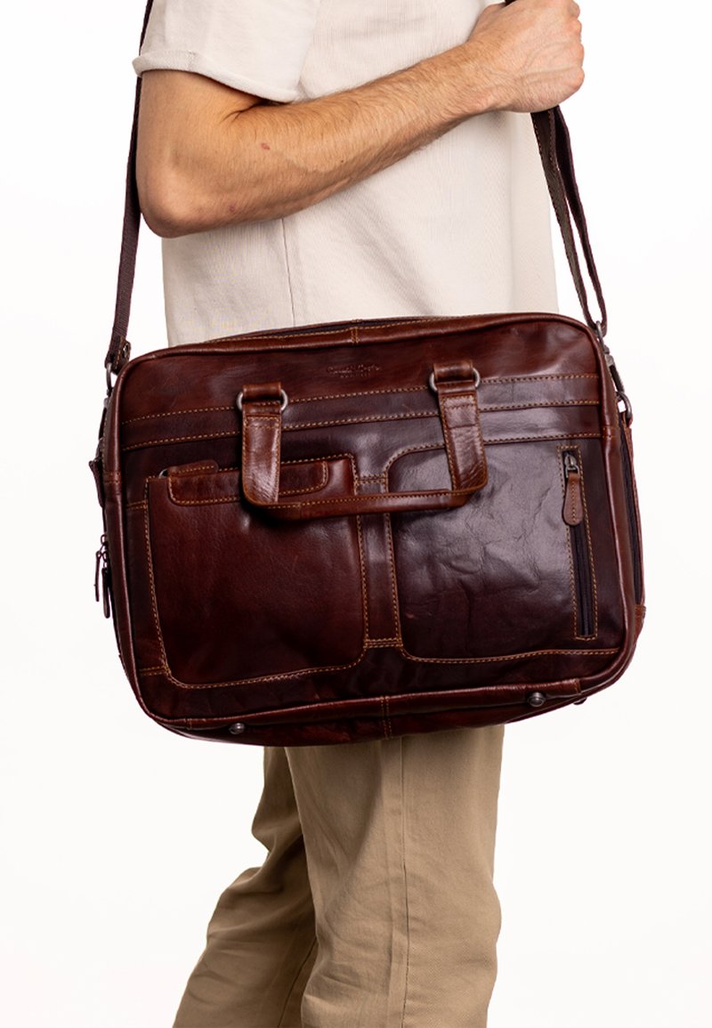 “Ripley” has a strap on the back so you can slip this briefcase onto the handles of your suitcase, your laptop will be kept secure even if you have to sprint to your connection. Carry this briefcase in your hand or over your shoulder like a satchel using the detachable, adjustable strap.