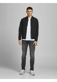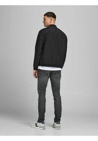 Gray denim jeans with a slim fit, featuring a subtle wash, five-pocket design, and paired with white sneakers and a black bomber jacket.