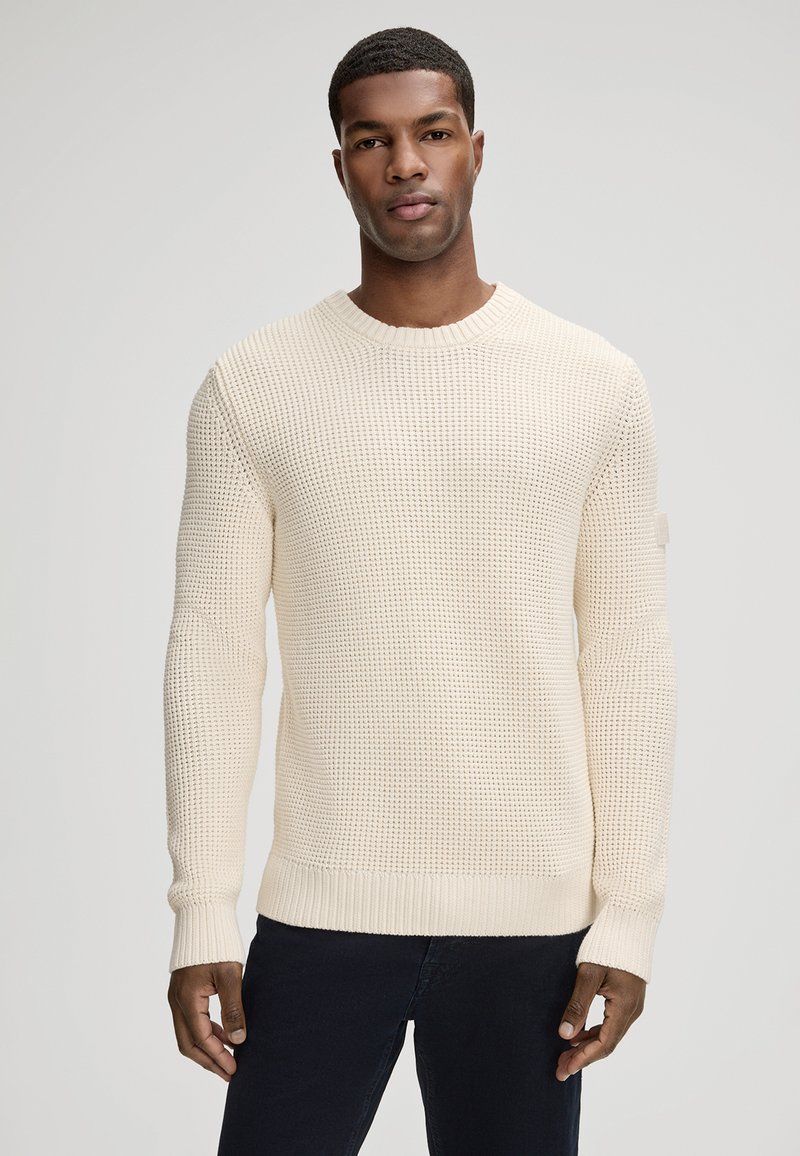 Cream textured knit sweater with a round neckline, ribbed cuffs, and hem. The design features a relaxed fit and subtle color variation.