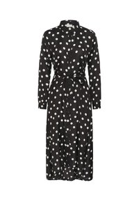 Navy button-up dress with a light-colored abstract pattern, long sleeves, a tied waist, and a flared skirt design. Soft, textured fabric.
