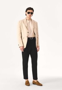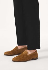 Classic slip-on loafers are a symbol of timeless elegance and unparalleled comfort. Made of soft, natural suede in a deep, warm shade of brown, they charm with a subtle texture that adds a sophisticated touch. The minimalist design, devoid of unnecessary ornamentation, emphasizes the versatility and versatility of this model. The slender line and gently rounded nose give them a classic chic look, making them a perfect match for both formal and casual outfits. The slip-on design guarantees comfortable wear and freedom of movement, making these loafers a must-have choice for any occasion. They pair perfectly with smart-casual suits, as well as with simple ensembles such as chinos and a linen shirt.