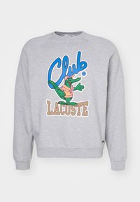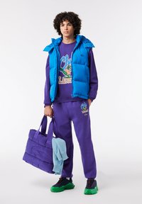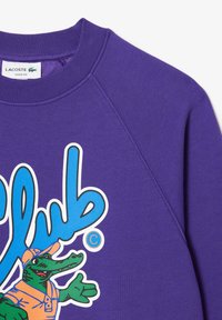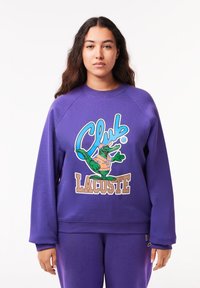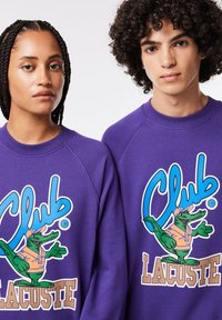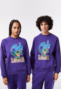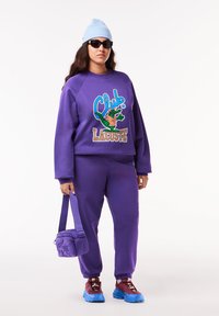 Two people wearing matching purple sweatshirts and pants with a colorful cartoon crocodile and "Club Lacoste" text.