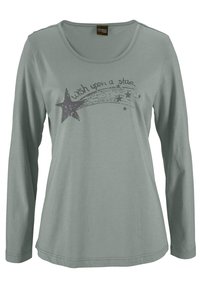 Two sets of women's loungewear: long-sleeve tops in sage green and purple with star graphics, paired with pajama pants featuring star patterns.