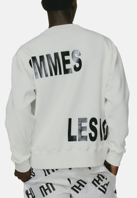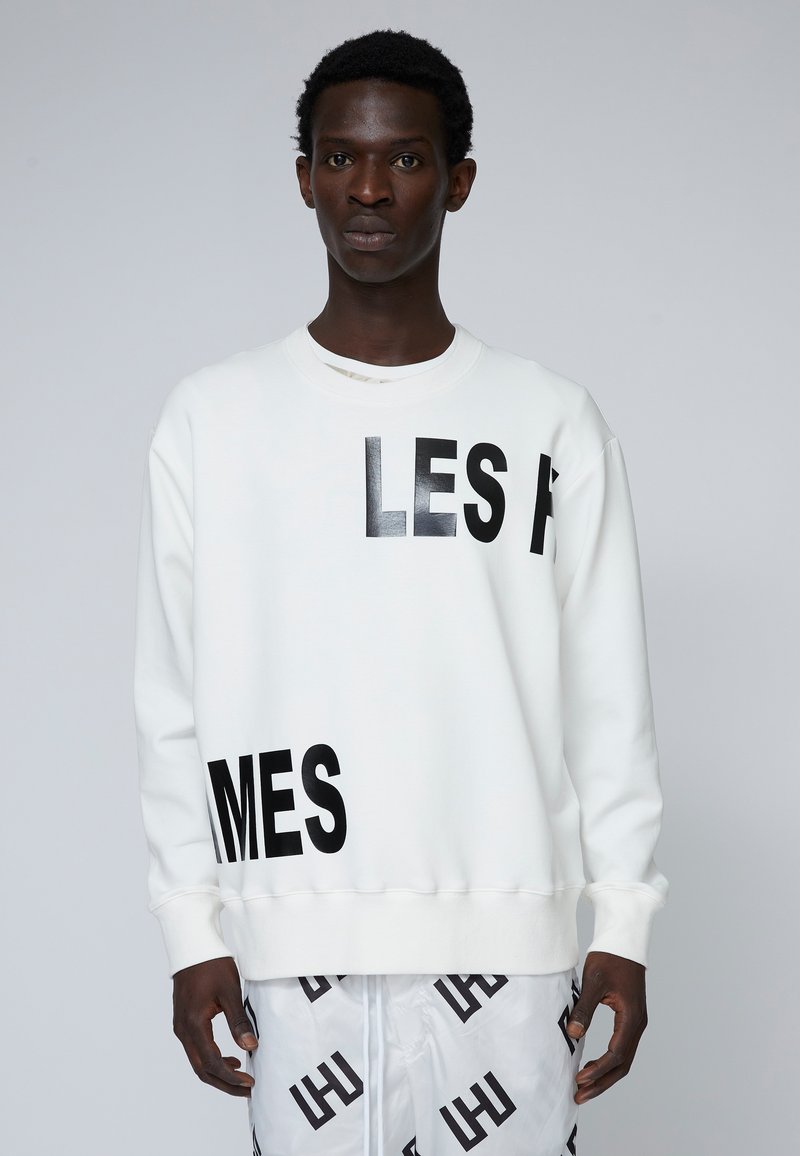 White sweatshirt with bold black text "LES" and "MES" printed on the front. Crew neckline, long sleeves, relaxed fit, and smooth texture.