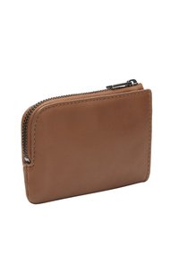 Brown leather wallet with a smooth texture, zip closure, and embossed brand name on the front. Compact rectangular shape, minimalistic design.