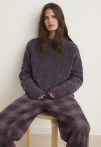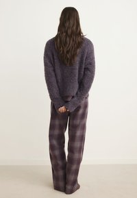 Woman standing wearing a fuzzy purple sweater, wide-legged plaid pants with drawstring, and matching purple socks against a plain light background.