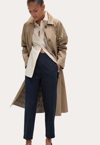 Person wearing beige trench coat, striped button-up shirt partially untucked, and high-waisted navy blue pants with hands in pockets.