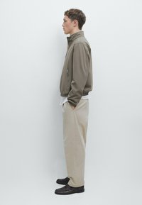 Young man wearing a taupe zip-up jacket over a white buttoned shirt and beige trousers, standing against a plain light gray background.