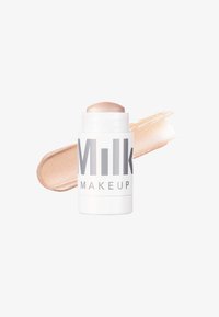 Warm the stick directly on the back of your hand before applying to help it glide on better. Apply the cream highlighter stick directly to cheekbones, brow bones, and the highest points of the face. Blend the color with fingertips, a brush, or a sponge. Apply multiple layers for more color intensity. Use on collarbones, shoulders, and legs to achieve a radiant glow. Pro tip: Use the Hydro Grip Set + Refresh Spray (sold separately) for an even longer-lasting, dewy finish. Use with other Milk Makeup sticks (sold separately) to complete your look in 60 seconds.