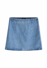 Black denim mini skirt, featuring a flat waistband, two front pockets, and a side zipper, with a smooth texture and a clean design.