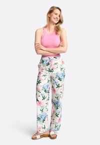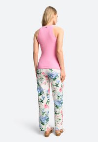 Pink ribbed tank top with a rounded neckline, paired with floral-patterned shorts featuring pink and blue flowers on a light background.