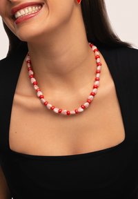 Die Heart to Heart Halskette aus vergoldetem Stahl ist perfekt für Liebhaber von einzigartigem Steinschmuck. Diese Halskette mit roten und rosa Herzperlen ist ideal als Geschenk zum Valentinstag.