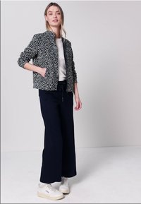 Young woman with long hair wears navy and white patterned zip-up jacket over a white shirt, hands in pockets, standing against a plain light background.
