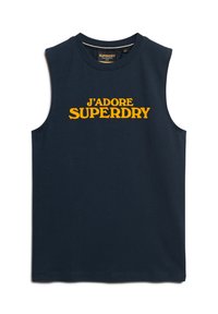 Light pink sleeveless top with "J'ADORE SUPERDRY" in bold red text. Paired with high-waisted light blue jeans and a black belt with a silver buckle.