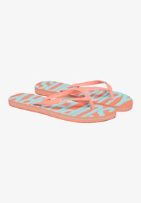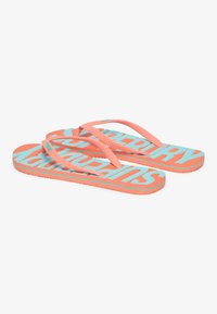 Pink flip flop with turquoise accents, featuring a textured sole and a prominent brand logo. Simple design and flexible straps.