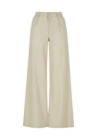 Black wide-leg pants with pleats at the waist, paired with a fitted white crop top. Model stands on a light background, wearing brown sandals.