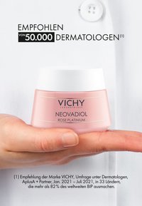 NEOVADIOL ROSE PLATINIUM from Vichy is a revitalising and strengthening day cream for very mature skin. With increasing age, the skin becomes drier, thinner and loses its natural radiance. The powerful, nature-inspired active ingredients reactivate the skin's vitality. Hyaluron binds moisture and plumps the skin. Beeswax provides intensive care and protection. Calcium strengthens, firms and rebuilds the skin. The pampering anti-ageing cream with a delicate rose fragrance and rose-coloured pigments ensures an intensive feeling of well-being and a rosy-fresh complexion. It brings out the natural, fresh radiance.